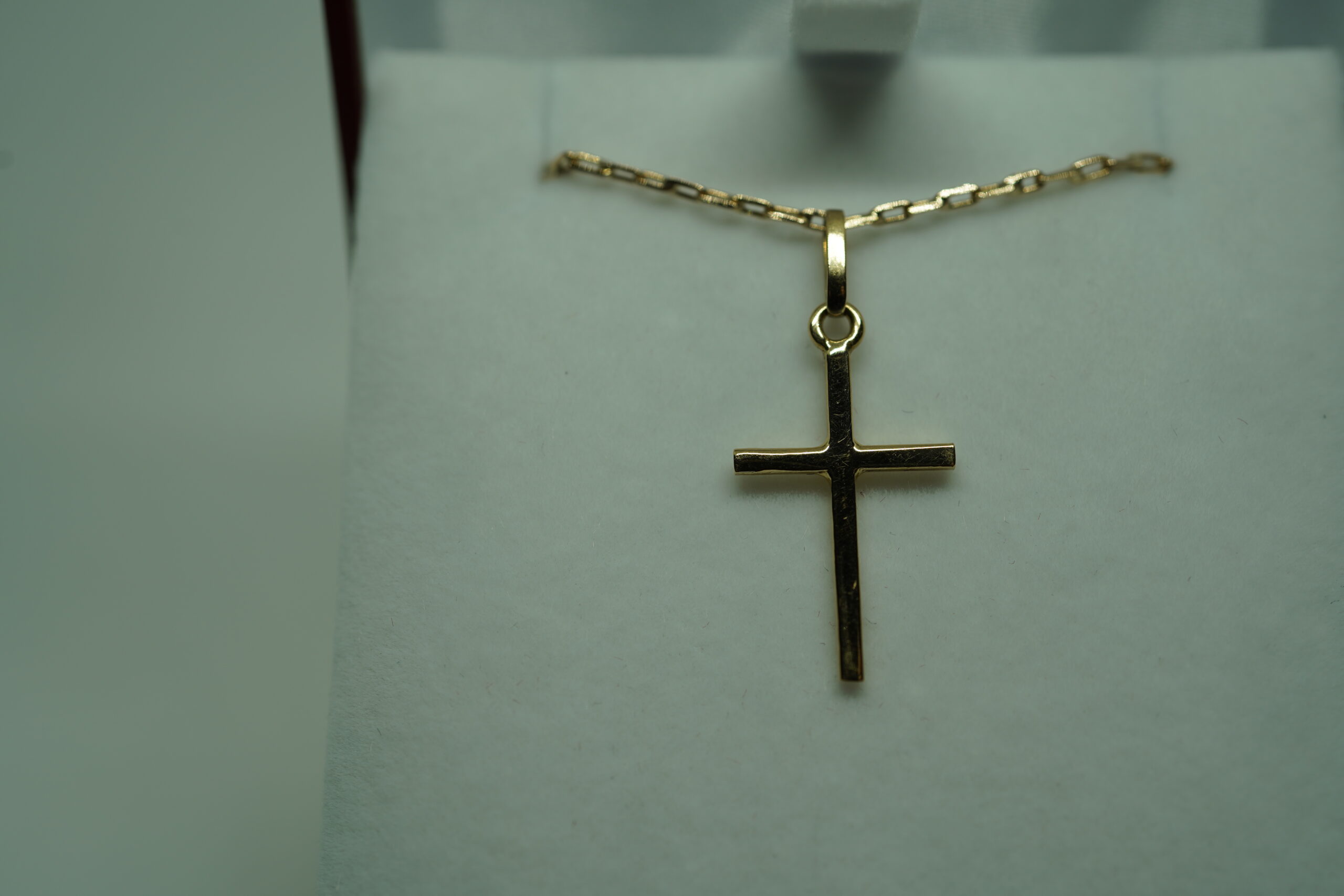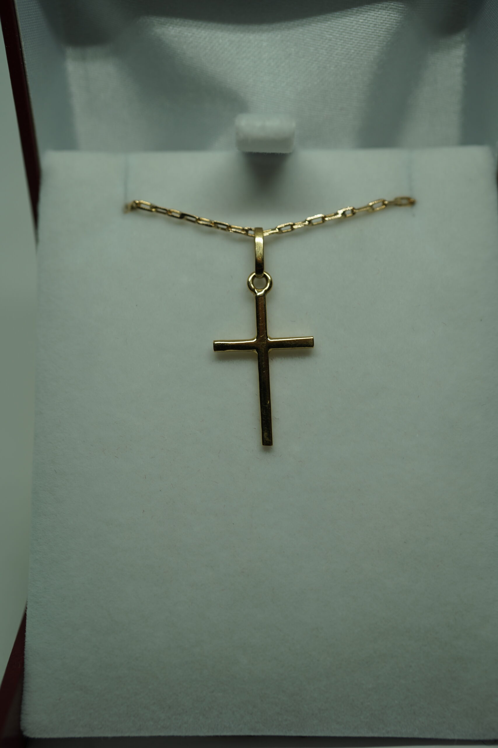 Esta cruz en oro rosa 18K, hecha a mano en Chile, destaca por su diseño limpio, equilibrado y atemporal.