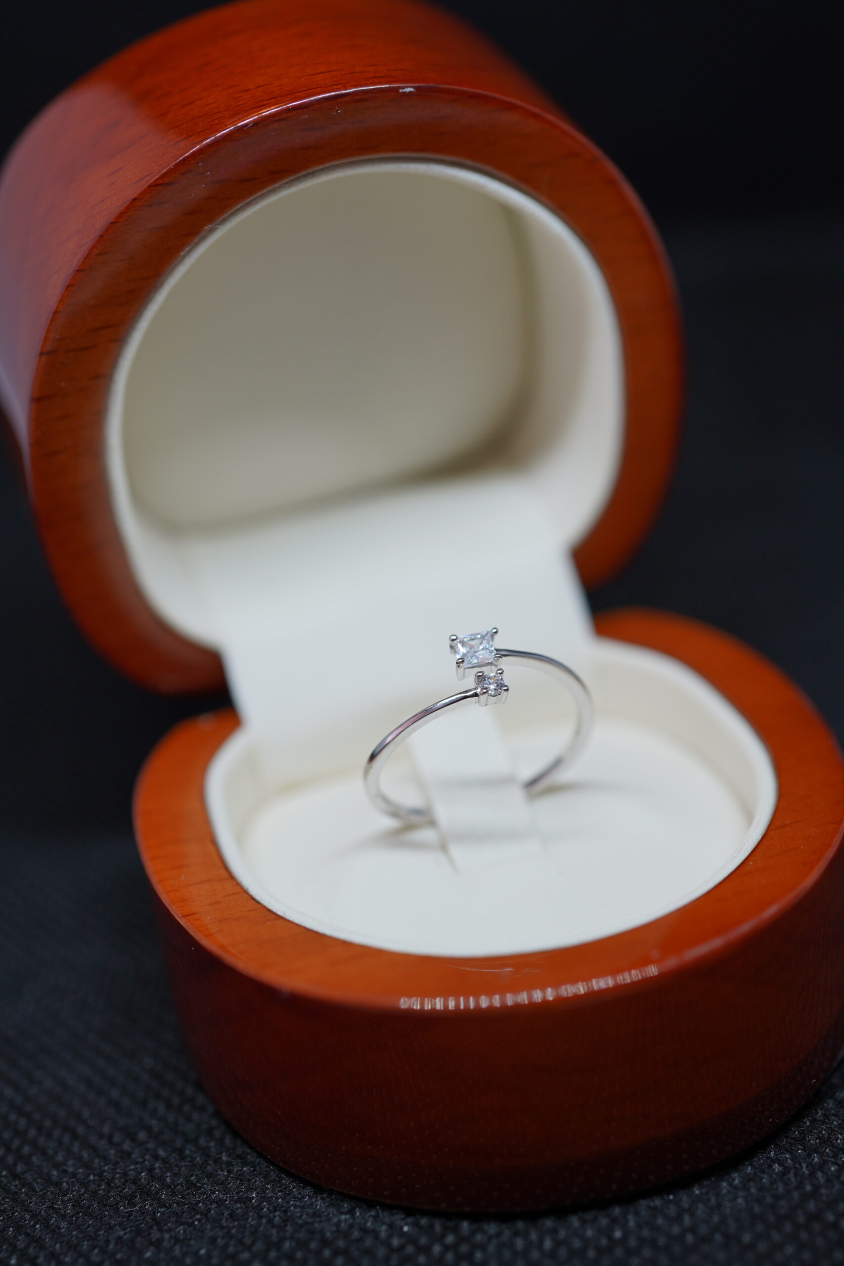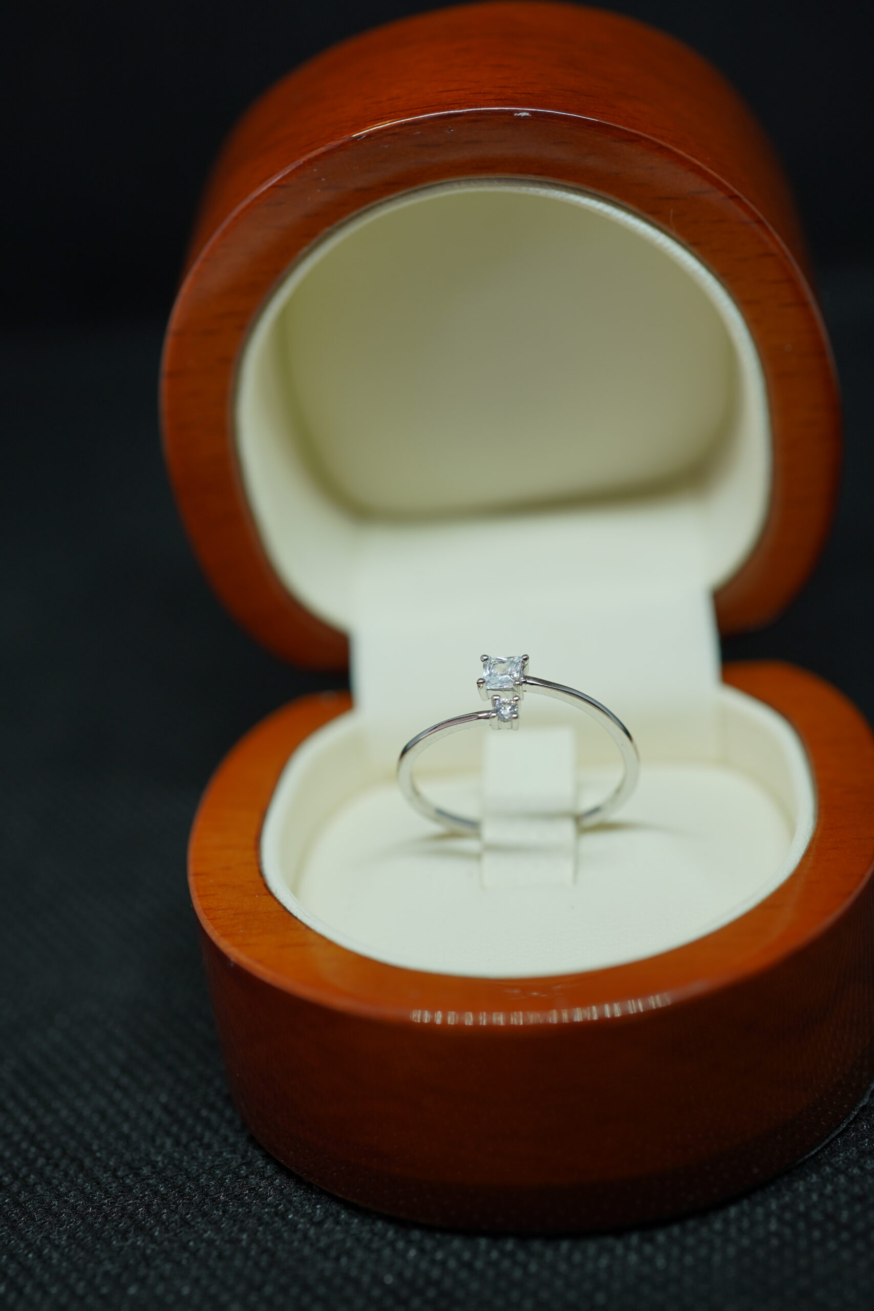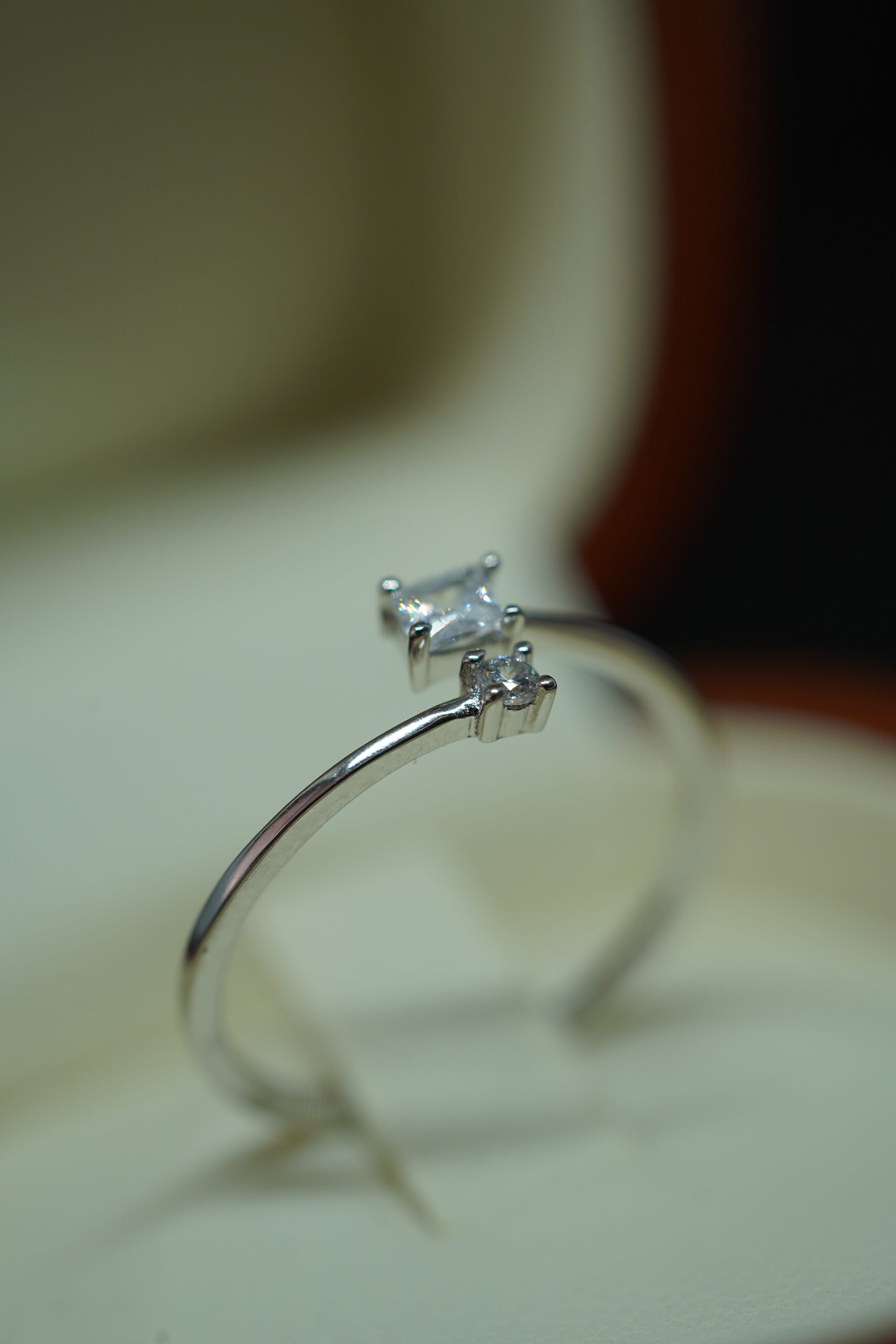 Su piedra principal de corte cuadrado aporta presencia y brillo, mientras el circon acompañante añade un sutil destello que realza la composición del anillo. Un diseño minimalista que transmite sofisticación y delicadeza.